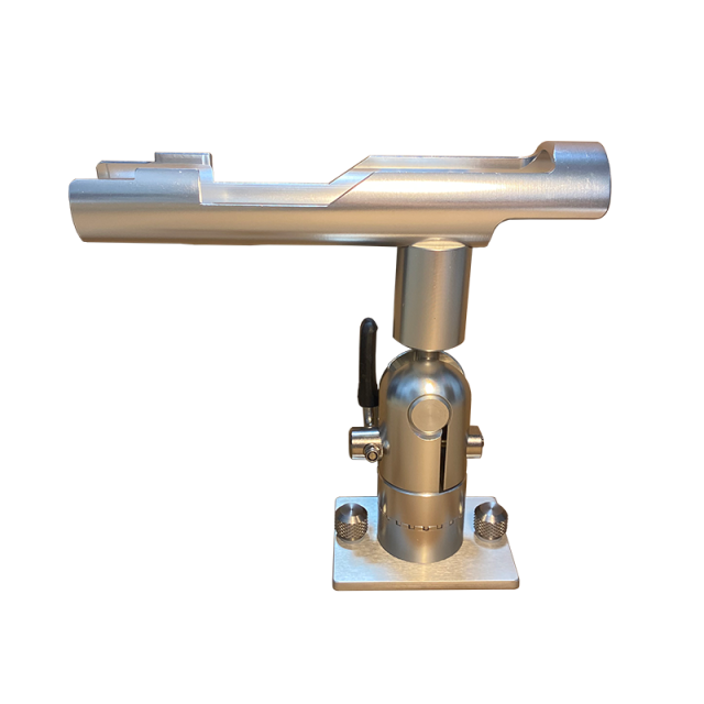 In addition to the radial movement, the cradle will adjust to any angle from 0-135° by actuating the padded lever. The lever can be rotated in any direction to meet the needs of each user. No tools are required for positioning of the rod holder. All aluminum components are anodized to military specs.
